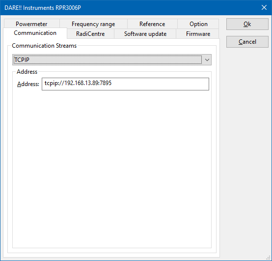Screenshot of the TCPIP communication stream configuration on the Communication tab of the device driver configuration dialog